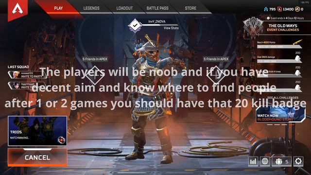 In this video I present the Easiest way to get almost every badge in Apex Legends by using a simple bug/glitch,that helps you to get in a noob lobby. There are 2 categories: 1. Without partener: Need to play solo and far from all your teamates,because you don't want to lose kills because of them.Yes,is a problem if you die because the players are noob but still have a decent aim or you have got third partyed and no one can help you,but then...just re-make the bug and try again.Play from medium-short range and try to avoid the shotgun and the sniper.And the most important...HAVE FUN! 2.With a partener: Go in the same spot/zone and try to loot as fast as you can.They will help you by letting them low but,be careful to not steal accidentaly your kills.Cordonate them and get that easy 20 kill badge. I recomand you to play with your friends because is WAY EASIER than playing solo. If you liked my video and want to see more,press that subscribe button,like,share and send a comment if you have recomandations or if you wanna se me live. Good luck everybody.