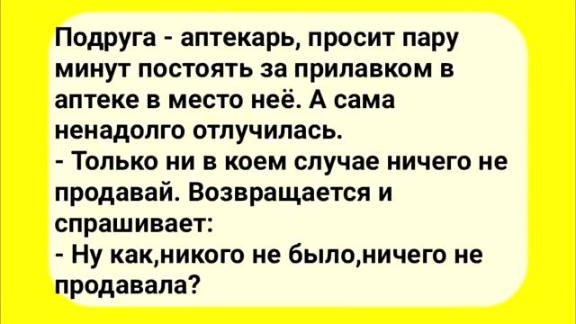 АНЕКДОТЫ! У Мужика Понос. Сборник Смешных Анекдотов! 00:04 Слон в семье • Один мужик рассказывает другому, что у него есть слон, который помогает по дому: поливает грядки, таскает брёвна на крышу, чистит колодец. • Второй мужик просит продать слона, но первый отказывается, считая его членом семьи. • Через месяц первый мужик жалуется, что слон всё испортил: растоптал грядки, сломал крышу, нассал в колодец, весь дом в говне, дети в ужасе, жена из комнаты не выходит. 00:47 Кашель и трусы • Пациентка приходит к терапевту с сухим кашлем, но её трусы мокрые. 01:00 Вино и бессмертие • Утверждение, что один бокал красного вина в день продлевает жизнь на пять лет. • Лена выпивает третью бутылку, стремясь к бессмертию. 01:14 Аптекарь и пурген • Подруга-аптекарь просит постоять за прилавком, но ничего не продавать. • Возвращается и узнаёт, что продала пурген мужчине, который боится даже кашлянуть. 01:48 Падающая звезда • Девушка видит падающую звезду и загадывает желание, чтобы парень на ней женился. • Звезда возвращается, и желание не исполняется. 02:02 Понос и обещания • Муж возвращается домой с поносом и просит жену открыть дверь туалета. • Жена требует купить ей сапоги, шапку и норковую шубу, несмотря на его состояние.