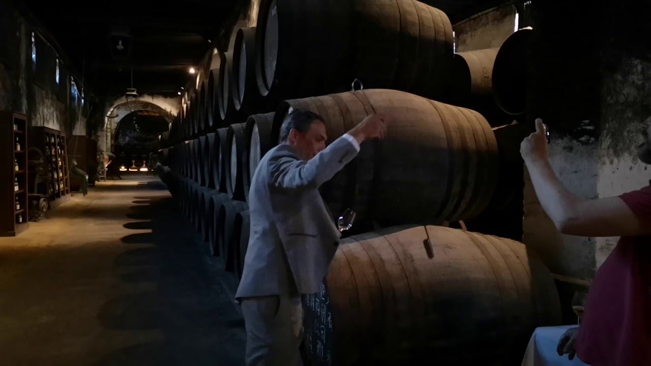 Винодел бодеги Осборн демонстрирует, как правильно пользоваться серебряным стаканчиком на длинном гибком стеке (вененсией) для отбора пробы хереса из бочки :)