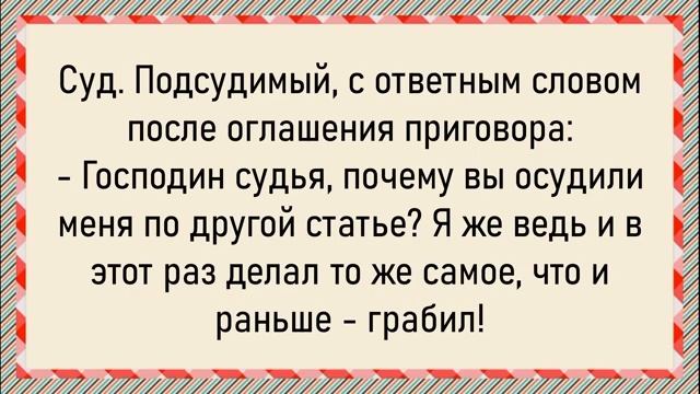 Как санитарка пациента оседлала! Сборник свежих анекдотов! Юмор! 00:00 Звери в яме • Заяц спрашивает льва, кто испортил воздух. • Лев отвечает, что это он. • Заяц восхищается запахом. 00:16 Девушка и водитель • Девушка просит водителя подвезти её в город. • Водитель предлагает подвезти с удовольствием, но девушка настаивает на оплате. 00:32 Стабильность • Василий Иванович объясняет, что стабильность — это отсутствие личного автомобиля. 00:44 Шеф и сотрудники • Шеф предлагает сотрудникам уйти пораньше, предлагая «сделать дело» под столом. • Сотрудники активно соглашаются, включая секретаршу и начальницу отдела кадров. 01:19 Влюблённый Изя • Изя влюбляется в Соню за её стройность и молчаливость. • После свадьбы он понимает, что Соня не могла одновременно говорить и втягивать живот. 01:32 В зоопарке • Папа успокаивает сына, говоря, что «так горела» — это ещё только касса. 01:42 Кулон с гравировкой • Муж дарит кулон с гравировкой «я всегда рядом». • Подруга шутит, что теперь ходит и оглядывается. 01:54 Кролик и крольчиха • Кролик и крольчиха убегают от волков и прячутся в погребе. • Крольчиха беспокоится о будущем, но кролик обещает «задавить их числом». 02:16 Новобрачная и муж • Новобрачная жалуется матери на мужа, который требует мясо к макаронам. • Мать советует исполнять просьбы мужа. 02:57 Уговор дороже денег • Папа объясняет сыну значение выражения «уговор дороже денег». 03:07 Психолог и воспитание • Муж и жена обращаются к психологу за советом по воспитанию ребёнка. • Психолог рекомендует лечить детские неврозы травами. 03:45 Золотая рыбка • Мужчина ловит золотую рыбку и просит построить автостраду. • Рыбка предлагает научить его понимать женщин. 04:22 Суд • Подсудимый удивляется, почему его засудили по другой статье. • Судья объясняет, что подсудимый грабил ювелирный магазин в одиннадцатый раз.