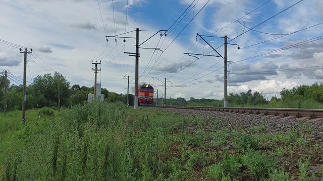Поезд несётся по рельсам.