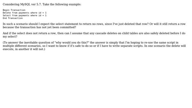 Databases: How does MySQL manage a delete then select of the same row within a transaction? Helpful? Please support me on Patreon: https://www.patreon.com/roelvandepaar With thanks & praise to God, and with thanks to the many people who have made this project possible! | Content (except music & images) licensed under CC BY-SA https://meta.stackexchange.com/help/licensing | Music: https://www.bensound.com/licensing | Images: https://stocksnap.io/license & others | With thanks to user Vincent (dba.stackexchange.com/users/48912), user Andriy M (dba.stackexchange.com/users/6965), and the Stack Exchange Network (dba.stackexchange.com/questions/291527). Trademarks are property of their respective owners. Disclaimer: All information is provided "AS IS" without warranty of any kind. You are responsible for your own actions. Please contact me if anything is amiss at Roel D.OT VandePaar A.T gmail.com