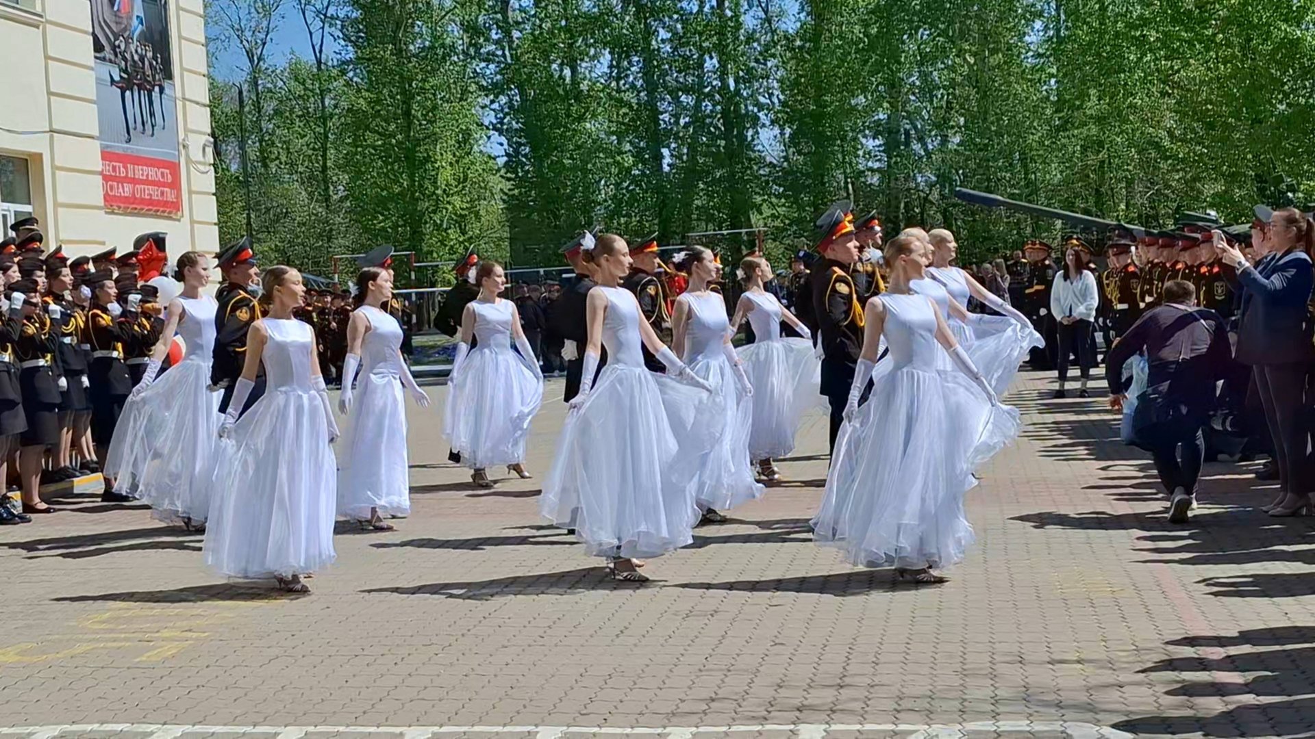 Хабаровск. Кадетская школа 1 им Ф.Ф.Ушакова.Традиционное мероприятие- прощание с флагом. Песню исполнил хор кадетской школы. Школьный двор и кадеты исполнили замечательный вальс.