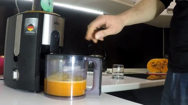 Выжимаю тыквенный сок. Сок очень вкусный и сладкий. Процесс выжимания сока соковыжималкой. Овощной сок очень полезен для здоровья