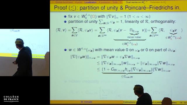 Enseignement 2018-2019 : Mathématiques appliquées Séminaire du vendredi 30 novembre 2018 : Estimations d'erreur a priori et a posteriori localisées sous régularité minimale Intervenant(s) : Martin Vohralik, INRIA-Paris Chaire Équations aux dérivées partielles et applications Professeur : Pierre-Louis Lions Retrouvez tous ses enseignements : https://www.college-de-france.fr/site/pierre-louis-lions Mots-clés : Stochastique, Théorie quantique des champs, Physique nucléaire, Equations aux dérivées partielles, Équations différentielles elliptiques, Équations différentielles non linéaires Le Collège de France est une institution de recherche fondamentale dans tous les domaines de la connaissance et un lieu de diffusion du « savoir en train de se faire » ouvert à tous. Les cours, séminaires, colloques sont enregistrés puis mis à disposition du public sur le site internet du Collège de France. Découvrez toutes les ressources du Collège de France : https://www.college-de-france.fr Suivez-nous sur : Facebook : https://www.facebook.com/College.de.France Instagram : https://www.instagram.com/collegedefrance Twitter : https://twitter.com/cdf1530 LinkedIn : https://fr.linkedin.com/company/collègedefrance
