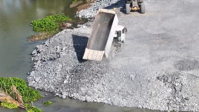 Погрузка крупных камней несколькими грузовиками с колесным погрузчиком, сбрасывающим камни в воду