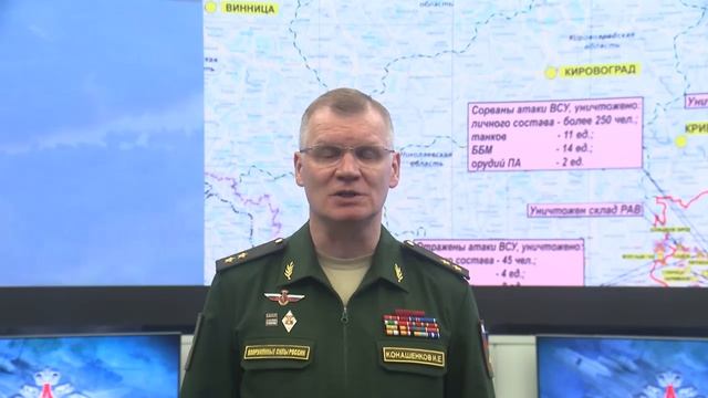 ⚠️ В течение суток Вооруженные Силы Российской Федерации продолжали нанесение ударов высокоточным оружием большой дальности воздушного базирования по объектам военного управления и системы энергетики Украины. Цели ударов достигнуты. Все назначенные объекты поражены. ◽️ На Купянском направлении в результате упреждающего огневого поражения российской артиллерии сорвана попытка наступления 92-й механизированной бригады ВСУ в районе населенного пункта Берестовое Харьковской области. Уничтожено до 50 украинских военнослужащих, 5 боевых бронированных машин и три пикапа с крупнокалиберными пулеметами. ? В районе населенного пункта Загрызово Харьковской области уничтожены три американские гаубицы М777. Кроме того, в районе населенного пункта Двуречная Харьковской области уничтожена наведенная ВСУ переправа через реку Оскол для выдвижения резервов, подвоза боеприпасов и материальных средств. ◽️ На Краснолиманском направлении ударами ракетных войск и артиллерии пресечены попытки противника форсировать реку Жеребец в районах населенных пунктов Стельмаховка, Макеевка Луганской Народной Республики и Ямполовка Донецкой Народной Республики. ? В районе Торского лесничества сосредоточенным огнем российской артиллерии поражен штурмовой отряд ВСУ, выдвигавшейся в направлении населенного пункта Кировск Донецкой Народной Республики. Уничтожено более 20 украинских военнослужащих и четыре бронированных автомобиля. ◽️ На Запорожском направлении в районе населенного пункта Времевка Донецкой Народной Республики российские войска продолжали уничтожать противника на занимаемых рубежах и овладели господствующими высотами в районе населенного пункта Нескучное Донецкой Народной Республики. Уничтожено более 40 украинских военнослужащих, один танк и три боевых машины пехоты. ◽️ На Криворожском направлении противник в течение суток силами до трех батальонов, в том числе одного танкового, предпринимал попытки прорыва обороны российских войск в районах населенных пунктов Кошара и Пятихатки Херсонской области. В ходе ожесточенных боев подразделения российской армии удержали занимаемые позиции, нанеся значительные потери противнику. Уничтожено более 250-ти украинских военнослужащих, 11 танков, 14 боевых бронированных машин и два орудия полевой артиллерии. ◽️ На Андреевском и Николаевском направлениях российскими войсками отражены атаки противника силами до мотопехотной роты каждая, в направлении населенных пунктов Садок Херсонской области, Зеленый Гай, Тамарино и Терновые Поды Николаевской области. Активными действиями российских войск при поддержке артиллерии все атаки противника отбиты. Уничтожено до 45 украинских военнослужащих, четыре боевые бронированные машины и восемь пикапов с крупнокалиберными пулеметами. ? Кроме того, ударами российских беспилотных летательных аппаратов уничтожены четыре радиолокационные станции артиллерийской разведки ВСУ «Зоопарк» и станция контрбатарейной борьбы производства США AN/TPQ-36. ? Всего за сутки на Николаево-Криворожском направлении уничтожено более 350 украинских военнослужащих, 11 танков, 18 боевых бронированных машин, восемь единиц специальной автомобильной техники и два орудия полевой артиллерии. ? Ударами оперативно-тактической и армейской авиации, ракетных войск и а