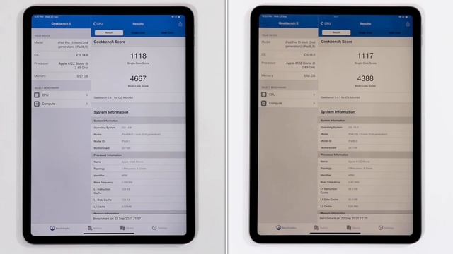 iPad Pro 11” 2020 GeekBench 5 test iPadOS 14 vs iPadOS 15