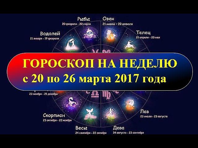Гороскоп на неделю с 20 по 26 марта 2017 года Для просмотра гороскопа используйте тайм код для знаков зодиака, расположенный ниже. 0:36 - Овен 2:02 - Телец 3:30 - Близнецы 4:58 - Рак 6:22 - Лев 7:41- Дева 9:02 - Весы 10:21 - Скорпион 11:47- Стрелец 13:03 - Козерог 14:20 - Водолей 15:38 - Рыбы 16:50 - Именины на этой неделе