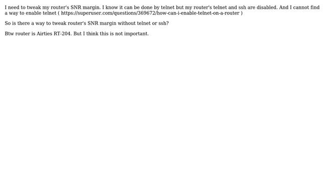 Tweaking SNR margin without telnet Helpful? Please support me on Patreon: https://www.patreon.com/roelvandepaar With thanks & praise to God, and with thanks to the many people who have made this project possible! | Content (except music & images) licensed under cc by-sa 3.0 | Music: https://www.bensound.com/royalty-free-music | Images: https://stocksnap.io/license & others | With thanks to user pjc50 (https://superuser.com/users/10680), user Leadri (https://superuser.com/users/110331), and the Stack Exchange Network (http://superuser.com/questions/369816). Trademarks are property of their respective owners. Disclaimer: All information is provided "AS IS" without warranty of any kind. You are responsible for your own actions. Please contact me if anything is amiss at Roel D.OT VandePaar A.T gmail.com.