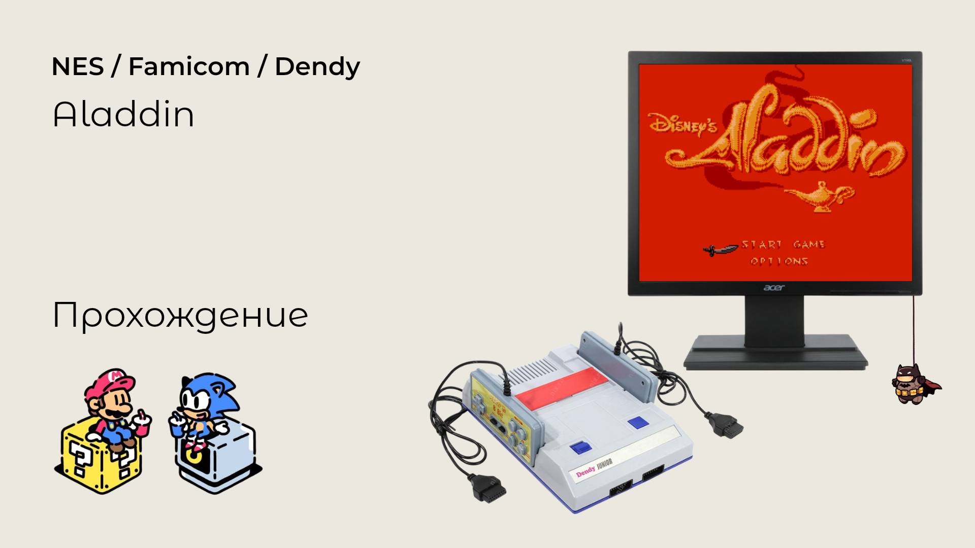 Порт игры с Game Boy от самой Virgin Games. Очень средне, даже можно сказать, слабо, выглядит. Ни динамики, ни графики - пиратские порты оказываются по всем статьям на голову выше этой официально изданной игры. В отличие от версии для Game Boy, версия для NES была выпущена только в Европе и никогда не выпускалась в Северной Америке или Японии. Заходите на наш сайт: https://consolgame.ru #nes #aladdin #retrogames #nintendo #dendy #consolgame #прохождение