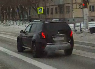 Пересечение стоп-линии и выезд на перекрёсток на запрещающий движение сигнал светофора. Госномер нарушителя Е448УТ 174, Renault Duster 2020 г.в., коричневый. Перекрёсток ул. Советской и пер. Советского. 04-02-2022 п. 6.16 ПДД Дорожный знак "Стоп-линия". Место остановки транспортных средств при запрещающем сигнале светофора. п. 6.2. ПДД - жёлтый сигнал запрещает движение, красный сигнал запрещает движение, зелёный сигнал разрешает движение. п. 6.13 ПДД - при запрещающем сигнале светофора... водители должны остановиться перед стоп-линией (знаком 6.16).