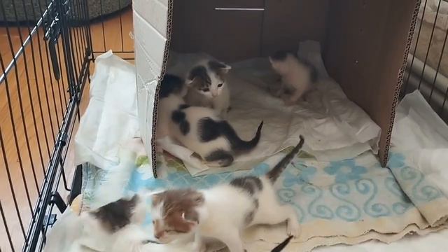 Молодое семейство котят в новой клетке