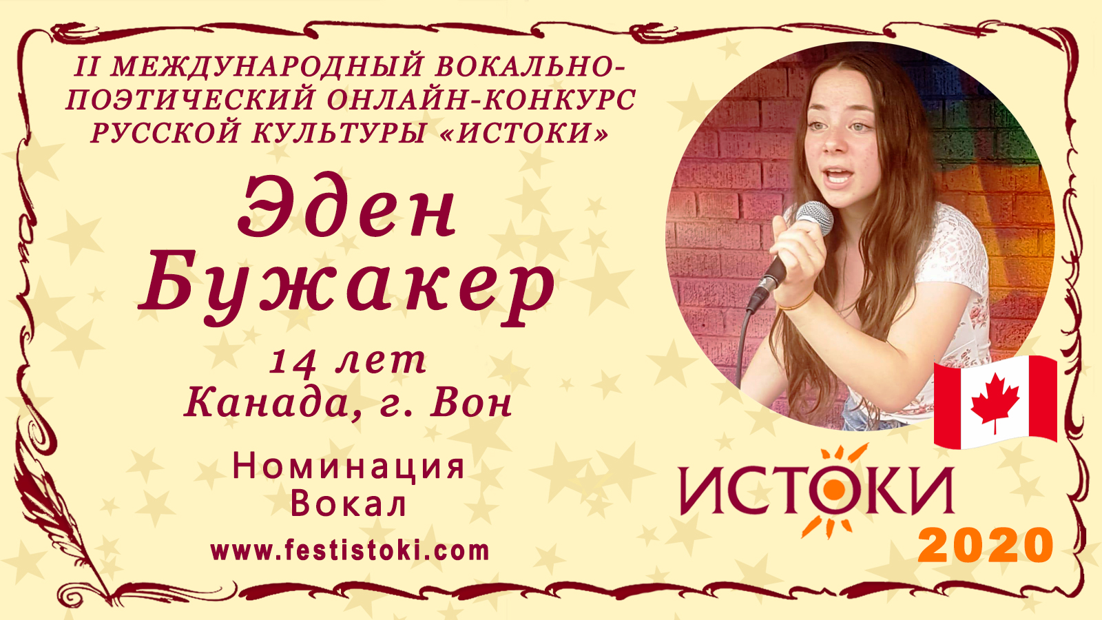 Участник II Международного вокально-поэтического онлайн-конкурса русской культуры «Истоки». Номинация - Вокал. Песня "А снег идет". Авторы А. Эшпай, Е. Евтушенко. Сайт: www.festistoki.ru / www.festistoki.com E-mail: festistoki@mail.ru