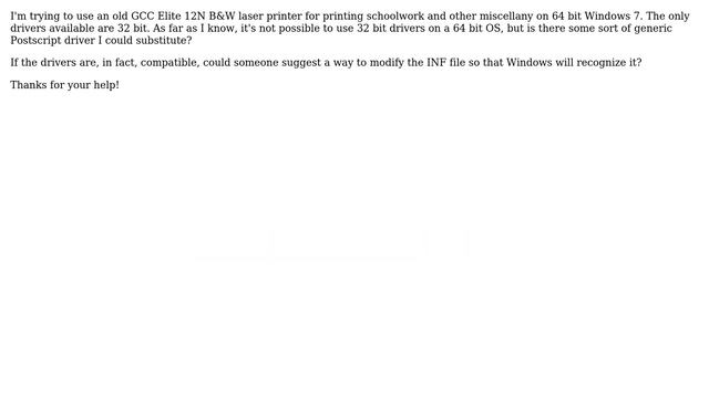 Substitute drivers for a 32 bit printer on a 64 bit OS Helpful? Please support me on Patreon: https://www.patreon.com/roelvandepaar With thanks & praise to God, and with thanks to the many people who have made this project possible! | Content (except music & images) licensed under CC BY-SA https://meta.stackexchange.com/help/licensing | Music: https://www.bensound.com/licensing | Images: https://stocksnap.io/license & others | With thanks to the Stack Exchange Network (superuser.com/questions/29679). Trademarks are property of their respective owners. Disclaimer: All information is provided "AS IS" without warranty of any kind. You are responsible for your own actions. Please contact me if anything is amiss at Roel D.OT VandePaar A.T gmail.com