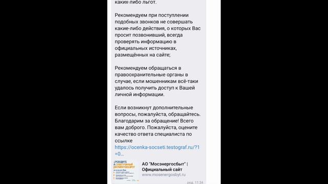 Всем добрый день. Сейчас на мой личный номер позвонил молодой человек и представился сотрудником Мосэнергосбыт и сказал, что мне полагается льгота по оплате и предложил ее оформить. Я отказалась и сказала, что уточню лично эту информацию в офисе Мосэнергосбыт. Номер телефона обычный, не городской даже 8-933-901... Сейчас зашла на сайт Мосэнергосбыт и спросила в чат бот и аналогично написала в личные сообщения. Ответ пришел практически сразу - все льготы получают только в отделе социальной помощи, оплата идёт полностью и потом на ваш счёт просто возвращается сумма. Расскажите пожалуйста об этом вашим родителям, бабушкам и дедушкам, а так же будьте бдительны и внимательны сами. Судя по тому, что данные звонки начались перед майскими праздниками, могу предположить, что это ещё и проверка на соответствие вашей ФИО, адреса и я не знаю какую информацию ещё хотели спросить у меня. Так же уже три раза в течение 10 дней днём в нашем районе полностью было отключение электричества - не работали светофоры на улице Карбышева и все наши дома были обесточены, а значит домофон и камера ( могу предположить) не работали в этот момент, а значит любой мог пройти в любой дом и в любой подъезд. Я уже много раз писала, что эти металлические двери не несут никакой защиты и безопасности, а только лишние расходы. До сих пор в почтовые ящики и на этажах развешана периодически реклама. Получается камера есть, но тех, кто приносить рекламу не штрафуют, хотя видят кто это делает... Вопрос - почему? Всем безопасного города. #2024 #россия #красногорск #город #дом #опасно #обман #жители
