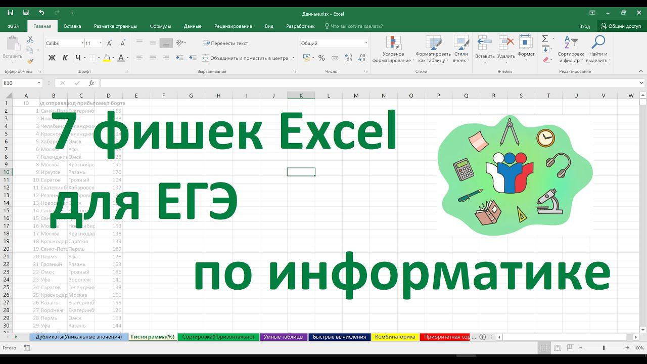 00:00 Использование Excel для анализа данных • В видео рассказывается о том, как использовать Excel для анализа данных, включая удаление дубликатов, поиск уникальных значений, сортировку и использование сводных таблиц. • Демонстрируются примеры использования этих функций для решения различных задач, таких как поиск количества рейсов из города отправления в город прибытия, определение доли города Москвы в рейсах и построение гистограмм. 10:50 Умные таблицы и срезы • В этой части видео рассказывается о том, как использовать умные таблицы для анализа данных, включая подведение итогов, использование срезов и шаблонов для анализа нескольких значений одновременно. • Демонстрируется пример использования умных таблиц для решения задачи нахождения всех пар элементов последовательности, сумма элементов которых равна числу, которого нет в последовательности. 13:29 Пример решения задачи 17 52 65 • В этой части демонстрируется пример решения задачи с использованием Excel, где необходимо найти все пары элементов последовательности, сумма элементов которых равна числу, которого нет в последовательности и меньше среднего арифметического всех четырехзначных чисел. • Решение задачи в Excel включает использование числового фильтра, выделение столбца и использование функции для определения среднего арифметического. 19:43 Решение задач с помощью Excel • В видео автор решает задачи из 17-го номера журнала "Квант" с помощью Excel. • Он объясняет, как использовать функции Excel для решения задач, таких как нахождение суммы элементов, сортировка данных и определение максимального веса. 23:26 Решение комбинаторных задач • Автор решает задачу с использованием комбинаторики, используя формулу сочетания без повторений. • Он также объясняет, как использовать функцию факториала для решения задач с перестановками и размещениями. 31:25 Решение задачи с использованием сортировки данных • Автор решает задачу, связанную с сортировкой данных, используя настраиваемую сортировку и функцию sum. • Он показывает, как использовать эти функции для определения максимального веса и стоимости самого тяжелого пакета. 38:53 Решение задачи с использованием больших файлов • Автор решает задачу с использованием большого файла, импортируя данные и разделяя их по пробелам. • Он объясняет, как настроить сортировку данных и найти максимальный вес и стоимость самого тяжелого пакета. 00:37 - Дубликаты и уникальные значения; 03:00 - Сводные таблицы и анализ данных; 07:25 - Горизонтальная сортировка; 10:50 - Умные таблицы; 12:48 - Быстрые вычисления (номер 17.333.5265 - прекалькуляция); 23:11 - Основные формулы комбинаторики (номер 11.4430); 30:55 - Приоритетная сортировка (номер 26.37.2836 - пакеты с углём) Поддержать проект: https://yoomoney.ru/to/4100117178785043 #егэ #информатика #excel