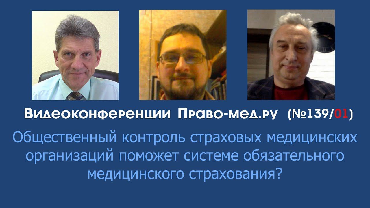 Видеоконференция Право-мед.ру № 139 (01) от 16 января 2020 года, на которой обсуждалась инициатива В. Матвиенко, поддержанная В. Скворцовой, по повышению ответственности медицинских страховщиков за качество оказываемых медицинских услуг. Тема: Общественный контроль страховых медицинских организаций поможет системе обязательного медицинского страхования? Рассмотренные вопросы 1.Правовые основания вменения (повышения) ответственности СМО за качество оказываемых медицинских услуг? 2. Необходим ли общественный контроль страховых медицинских организаций? 3. Будет ли инициатива реализована законодательно? Участники Панов Алексей Валентинович, главный редактор информационного портала Право-мед.ру, г. Омск , член АЮР Гаганов Дмитрий Борисович, юрисконсульт Ассоциации организаторов здравоохранения в онкологии г. Санкт-Петербург Васильев Игорь Валерьевич, доцент кафедры общественного здоровья и здравоохранения НГМУ, г. Новосибирск, член АЮР Тайминг (минуты) Панов А.В. : вступление 00:02: - 00:06 1 Вопрос: 00:06 - 00:10 2 Вопрос: 00:10 - 00:19 3 Вопрос: 00:19 - 00:24