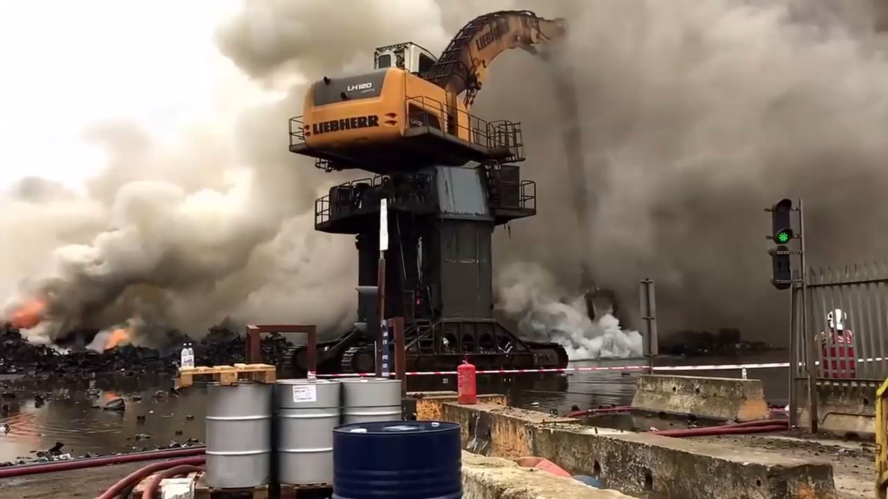 Экскаватор Liebherr ликвидирует пожар на свалке, бросая горящий мусор в воду. #техника #пожар #свалка