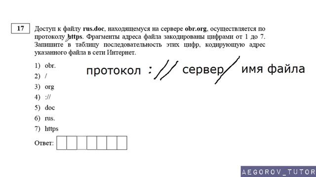 Разбор задания № 17 Демо варианта 2018 по ОГЭ информатике и ИКТ Тема задачи "Составление адреса URL из частей" Добавляйтесь в группу https://vk.com/aegorov_tutor Предложить задачу для разбора https://vk.com/topic-116207750_38371445 Задать вопрос по задаче из ОГЭ https://vk.com/topic-116207750_37403077