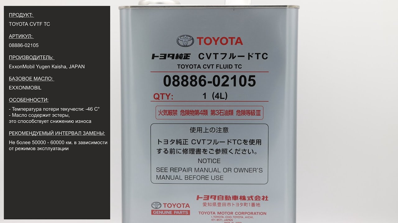 Продукт: Жидкость для вариатора Toyota CVTF TC Наш телефон: 8-800-550-57-22 ПН-ПТ 9.00-17.00 (МСК+4) Артикул: 08886-02105 Производитель: ExxonMobil, Yugen Kaisha Базовое масло: EXXONMOBIL Продукт EXXONMOBIL: Mobil CVTF 3320 Ссылка для покупки: https://mygt.ru/Oil/selection/toyota-cvt--4-l--maslo-v-akpp.html Особенности: - Температура застывания: -46°C - Масло содержит эстеры, это способствует снижению износа - Рекомендуемый интервал замены: не более 50000 - 60000 в зависимости от режимов эксплуатации Отличие упаковки оригинала: - Ровный сварной шов на боку канистры - Шлифовка метала на ручке типа bridge перпендикулярно самой ручке - Следы от колесиков конвейера на дне упаковки в виде параллельных полос - Дата производства тары на дне упаковки должна быть ровна или ранее даты блендирования продукта Ссылки на дополнительные материалы по продукту: http://nskrobot.ru/images/FOTO/MYGT_RU/08886-02105.pdf #характеристикимасла0888602105 #моторноемасло #antonmygt #mygtru #mygtauto #oemcatalog Наш сайт: MYGT.RU Наш канал ПРАВДА ПРО АВТОМАСЛА: https://www.youtube.com/channel/UC5JygfcXAA5Xq18sxUx_wIQ/ Телефон: 8 800 550 57 22 Бесплатно по России. Внимание! Полное либо частичное копирование данного материала без согласия автора допускается только при указании ссылки на источник (данный канал). Все права защищены. ANTON_MYGT #anton_mygt #anton_voronkov #mygtauto #масломан #каталог масел и спецжидкостей