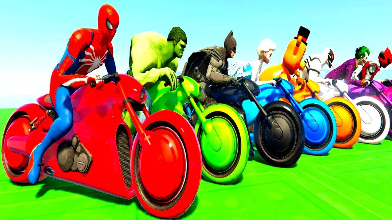 Мультик для детей. Супергерои гоняют на цветных Электромотоциклах. Веселый мультфильм для малышей.