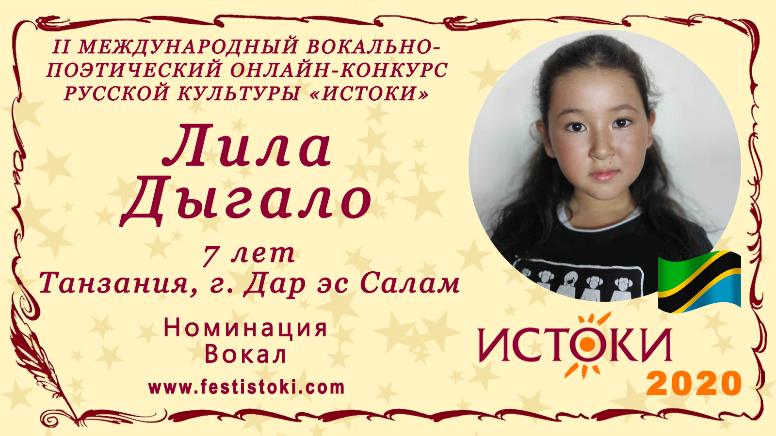 Участник II Международного вокально-поэтического онлайн-конкурса русской культуры «Истоки». Номинация - Вокал. Песня "Прекрасное далеко". Автор слов: Юрий Энтин Композитор: Евгений Крылатов. Сайт: www.festistoki.ru / www.festistoki.com E-mail: festistoki@mail.ru