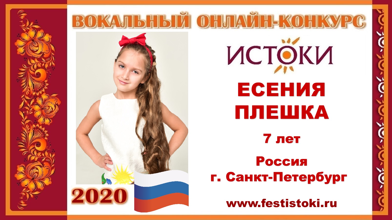 Участница Вокального онлайн-конкурса "Истоки"-2020. Песня "Вечный огонь". Авторы: слова Е. Аргановича, музыка Р.Хозак. Сайт: www.festistoki.ru / www.festistoki.com E-mail: festistoki@mail.ru