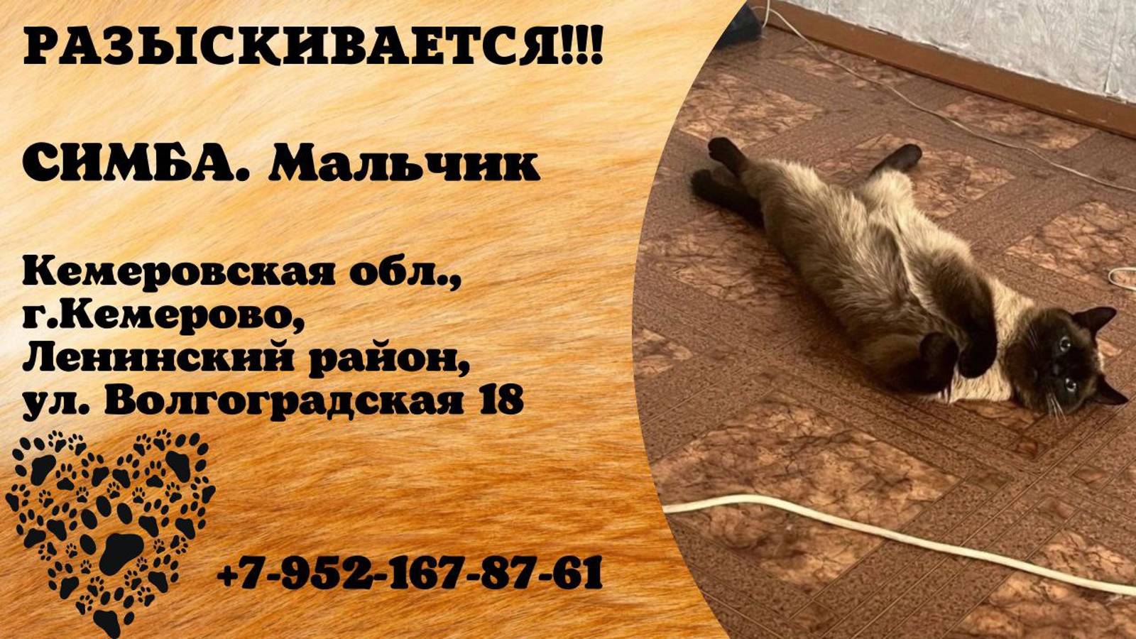 Кемеровская Кемерово Пропал кот Здравствуйте! Пропал кот 16.08.2024 , порода сиамец. На нём красный ошейник с колокольчиком. Откликается на имя Симба. Пропал Ленинский район , Волгоградская 18. Телефон для связи 8-952-167-87-61 НАШЕДШЕМУ КОТА, ДЕНЕЖНОЕ ВОЗНАГРАЖДЕНИЕ! Инфо: https://vk.com/wall-198815410_149564 Автор: https://vk.com/id156969042