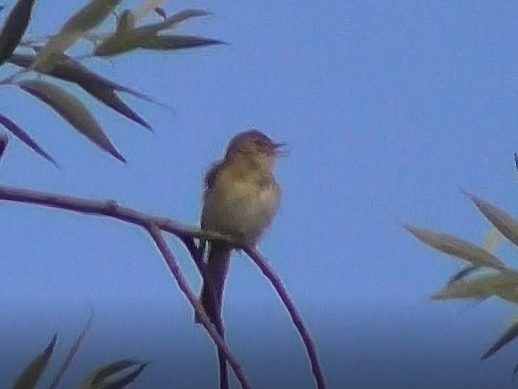 птица Пеночка-Весничка, Phylloscopus trochilus, поёт на дереве 17.07.2022, Великий Новгород
