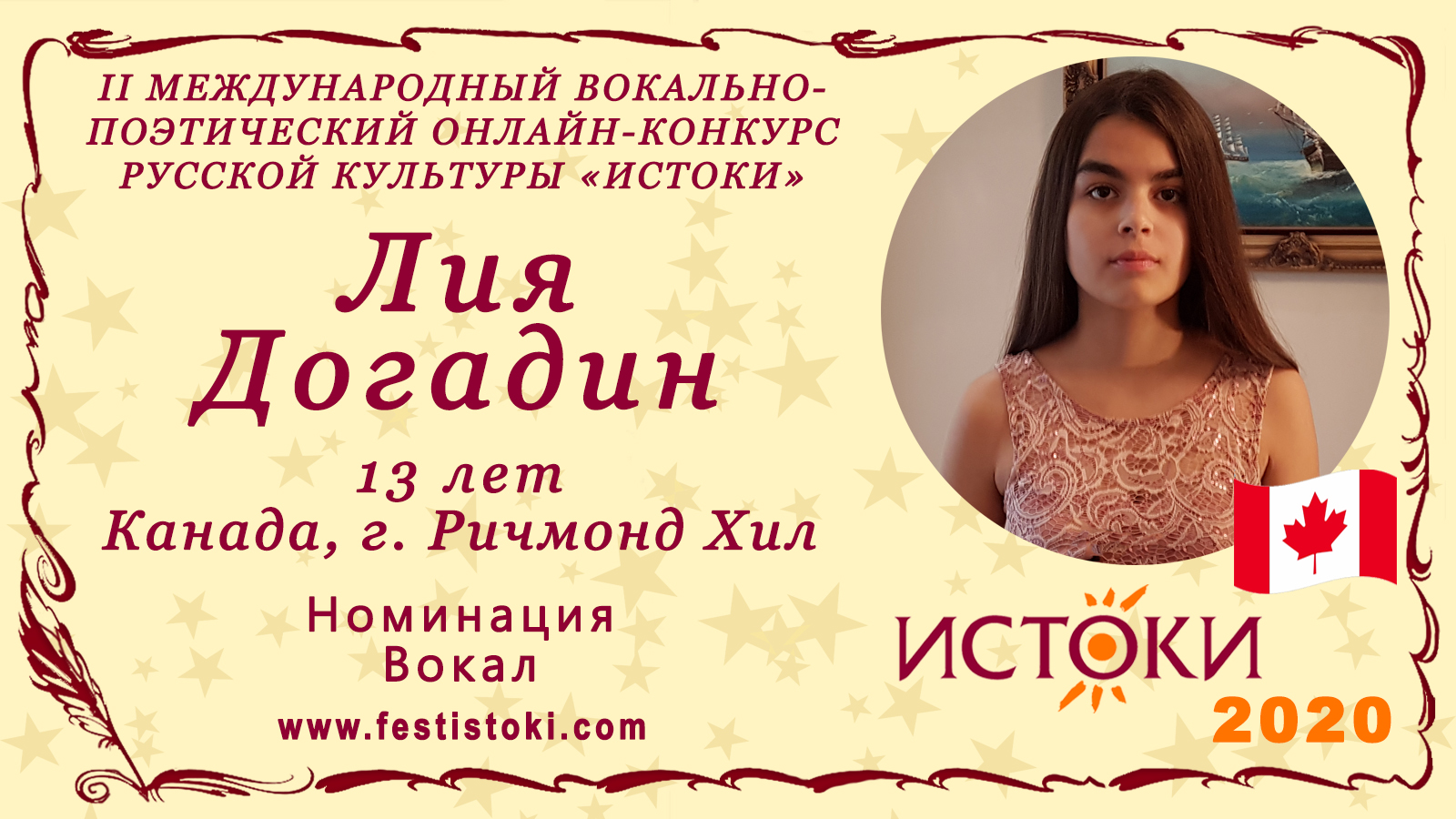 Участник II Международного вокально-поэтического онлайн-конкурса русской культуры «Истоки». Номинация - Вокал. Песня "Лебединая верность" Авторы Е.Мартынов/А.Дементьев Сайт: www.festistoki.ru / www.festistoki.com E-mail: festistoki@mail.ru