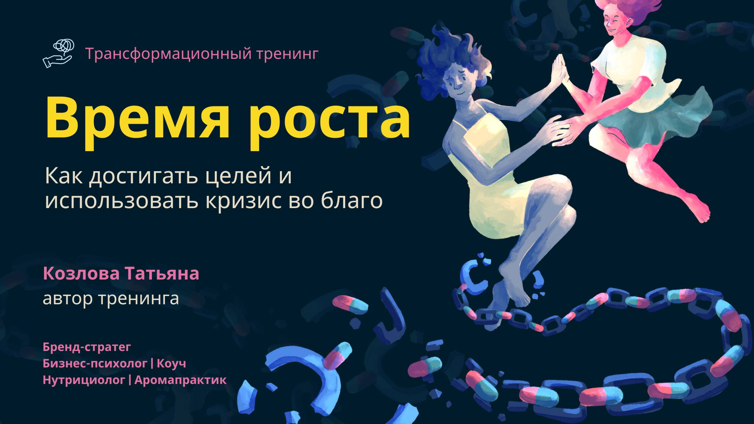 **Трансформационный тренинг "Время Роста: Как достигать целей и использовать кризис во благо!"** Этот тренинг предназначен для тех, кто находится в состоянии кризиса и хочет изменить свою жизнь, но не знает, как это сделать. Если вы чувствуете, что прежний образ жизни больше не подходит вам, но не знаете, с чего начать, этот тренинг для вас! Меня зовут Татьяна Козлова. Я бренд-стратег, коуч и бизнес-психолог, и за 45 лет жизни я пережила множество кризисов. Сегодня я с уверенностью могу назвать себя Счастливым Человеком! Методики, которые я представляю в тренинге, просты в применении и крайне эффективны — они помогли не только мне, но и многим моим клиентам. Если вы хотите также обрести внутреннее счастье и достичь своих целей, просто напишите мне о своем желании в любом из мессенджеров (ссылки ниже): - [Telegram] https://t.me/kozlova_selfbranding - [WhatsApp] https://wa.me/message/AHOC42BOO2JFB1 Также приглашаю вас присоединиться к моему каналу о мышлении и личном бренде: https://t.me/KOZLOVA_pro_BRAND Давайте вместе двигаться к вашему новому, счастливому жизненному этапу!