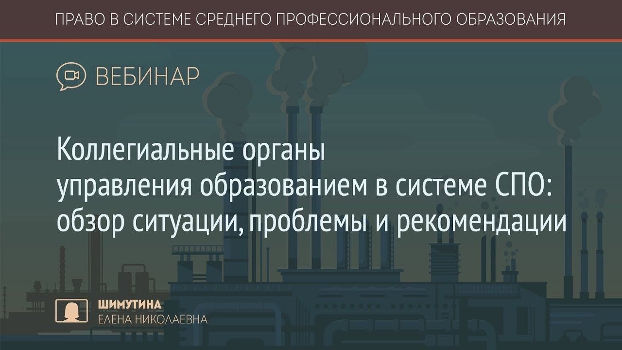 Вебинар по теме «Коллегиальные органы управления образованием в системе СПО: обзор ситуации, проблемы и рекомендации» был проведен 14 декабря 2017 года в рамках проекта «Право в системе среднего профессионального образования» Ведущая вебинара - Шимутина Елена Николаевна - к.п.н., Мастер Делового Администрирования (МВА), директор АНО «Институт развития государственно-общественного управления образованием», заместитель директора ГАОУ Центр образования «Царицыно», член Экспертного Совета по законодательному обеспечению образования при Комитете Совета Федерации по образованию и науке. Елена Николаевна рассказала о результатах исследования (анкетирование и анализ сайтов) по вопросу участия общественности в управлении образованием в системе СПО: какие коллегиальные органы существуют, какие решения принимаются, насколько активны родители, студенты и кооптированные члены в работе управляющих советов оранизаций СПО. Институт развития государственно-общественного управления образованием: http://gouo.ru