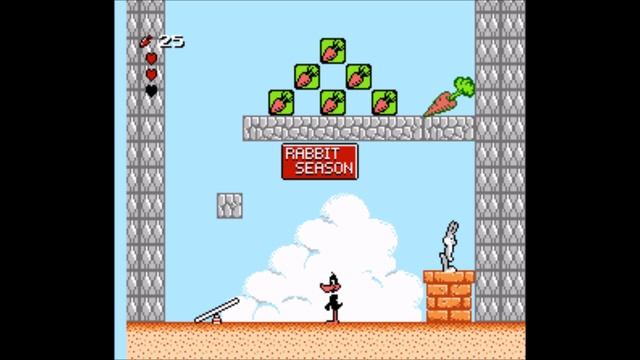 «Happy Birthday Bugs» – Платформер о похождениях Багса Банни, приуроченный к его пятидесятилетию. Очень красивые сюжетные вставки, но при геймплее изображение немного хуже. Суть проста – бежим слева направо, бьём врагов молотком, перепрыгиваем препятствия и собираем морковку. Вместо битвы с боссом – избегание его соприкосновений и экстремальное коллекционирование корнеплодов. Их тратим в бонусных мини-играх. На первый взгляд – не плохо, да и сюжет интересный (хоть и выбрал для ознакомления японскую версию, по картинкам всю суть понял). Хотя нет, с боссами придётся повозиться, разнообразие имеется. На бонусах набрал максимальное количество жизней достаточно быстро (спасибо магии эмулятора). А после каждого четвёртого уровня – бонусы новые! Уровней 24, забеги устраиваем не только по стандарту «слева направо», но позже и во все стороны, лабиринты растут, сложность увеличивается. Хотя проблемы у меня возникали лишь с двумя последними боссами, да и совсем небольшие. В целом неплохо, но затянуто и однообразно.
