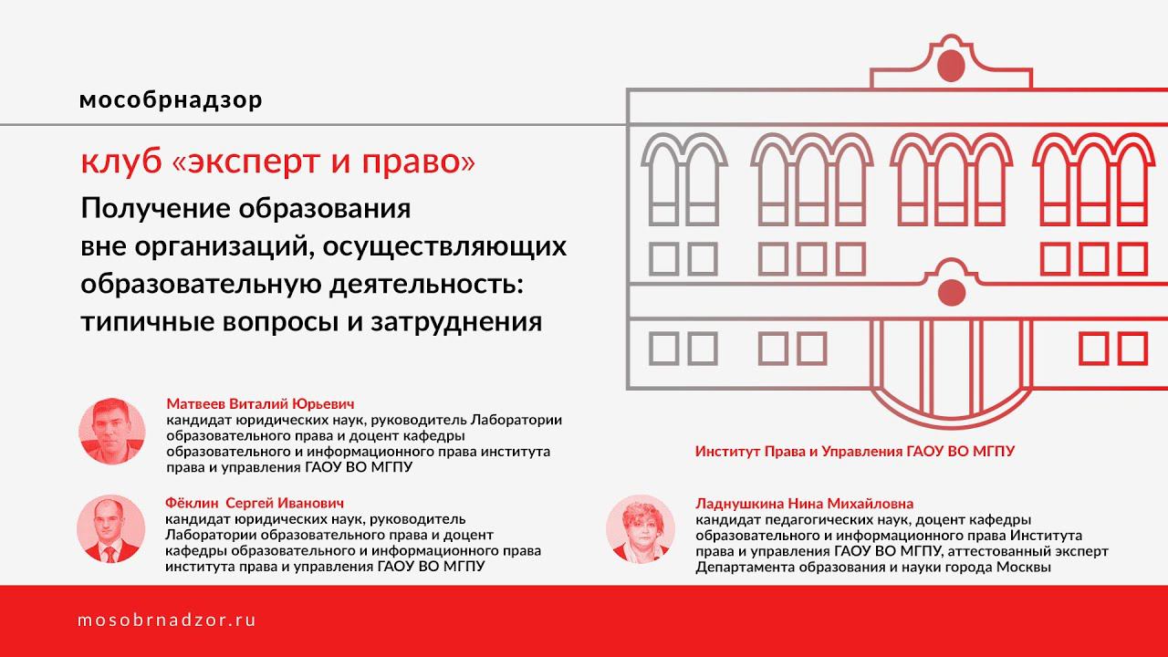23 апреля 2021 года прошло двадцать пятое заседание клуба «Эксперт и право». В рамках заседания клуба обсуждались следующие вопросы: - Правовое регулирование семейного образования, самообразования, экстерната и обучения на дому: пробелы в регулировании или предоставление свободы заинтересованным лицам? - Самообразование и экстернат в профессиональном образовании: миф или реальность? - Освоение различных видов образовательных программ вне организаций, осуществляющих образовательную деятельность: декларации и реальность. Ведущие встречи: Матвеев Виталий Юрьевич, кандидат юридических наук, заведующий лабораторией образовательного права, доцент кафедры образовательного и информационного права Школы права Института права и управления ГАОУ ВО МГПУ, Ладнушкина Нина Михайловна, кандидат педагогических наук, доцент кафедры образовательного и информационного права Школы права Института права и управления ГАОУ ВО МГПУ, Фёклин Сергей Иванович, кандидат юридических наук, доцент, руководитель Юридической клиники (консультации) и доцент кафедры образовательного и информационного права института права и управления ГАОУ ВО МГПУ Страница мероприятия на сайте Мособрнадзор.РФ: http://mosobrnadzor.ru/expert_i_pravo/2021-04-23_16-30 _______ С сентября 2019 года в МГПУ начал работу городской клуб «Эксперт и право». На встречах проходит обмен опытом правового регулирования в форме отрытых диалогов и свободных дискуссий. представляются и пересматриваются известные идеи и концепции, обсуждаются коллизии и пробелы законодательства в сфере образования, предлагаются пути их решения.