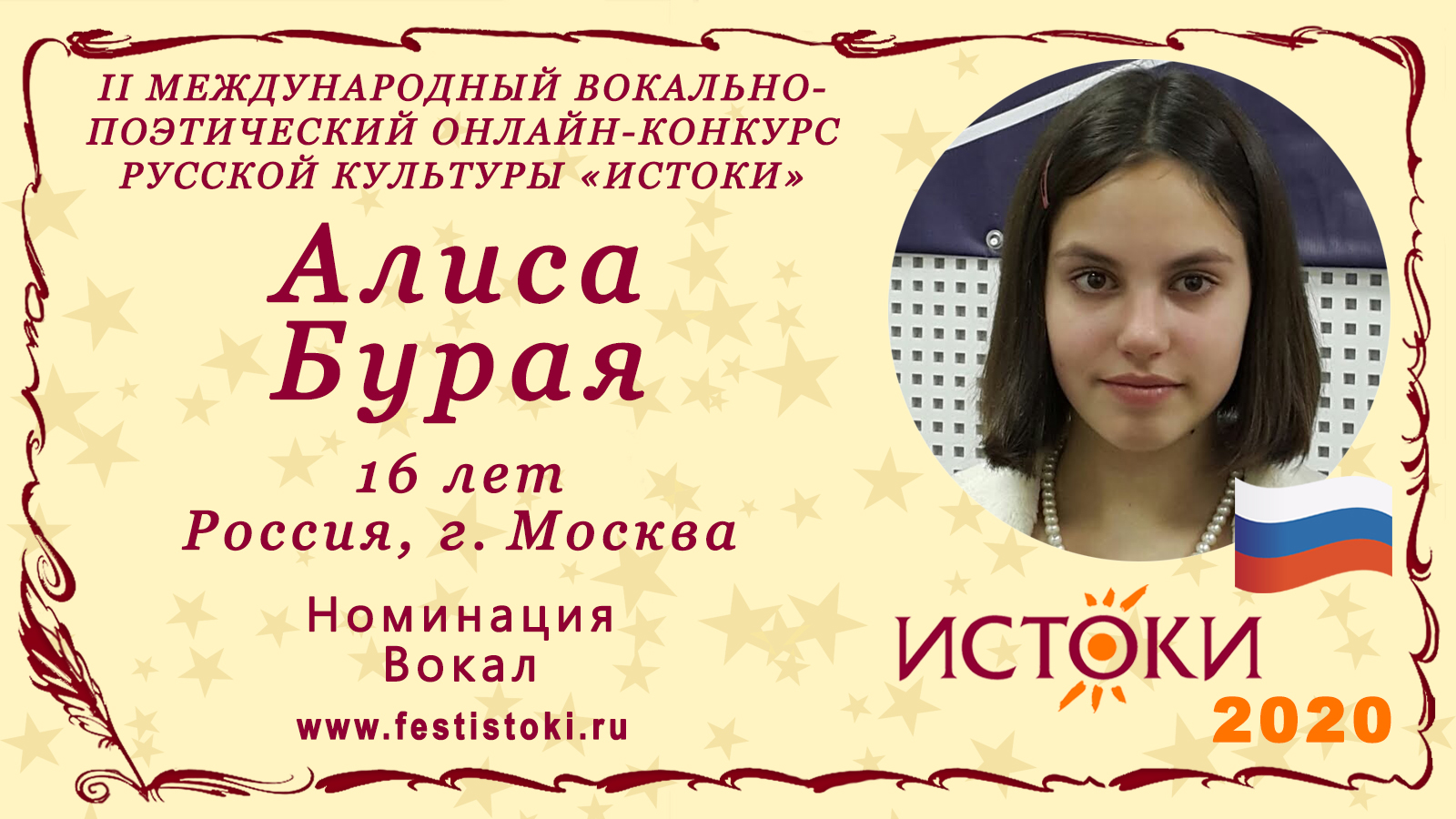 Лауреат III степени II Международного вокально-поэтического онлайн-конкурса русской культуры «Истоки». Номинация - Вокал. Песня "За дальнею околицей". Музыка Н. Будашкина, слова Г. Акулова. Сайт: www.festistoki.ru / www.festistoki.com E-mail: festistoki@mail.ru