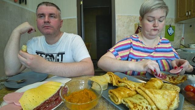 Мукбанг я в шоке от реакции мужа на блины! Ест их и критикует! Обед блинчики с начинкой, колбаса