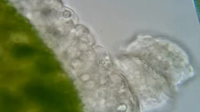Trichodina pediculus -- the so-called "polyp louse" (Roesel, 1760) -- is a small peritrich ciliate that lives parasitically on freshwater Hydra. There were two of them on this polyp (the common Hydra viridissima). At one point, one of them mounted the other, and stayed there until shaken loose by the Hydra's death throes. It is possible that this was an attempted conjugation.
