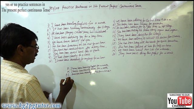 Yes or No practice sentences in The Present Perfect Continuous Tense 1 Trainer: V Siva Prasad target Audiences: School and college going, students and kids Website: http://kg2pgtutor.com/ Subject: Learn step by step Spoken English and Grammar Free material: Send a test mail to vsivaprasadtutor@gmail.com Copyright: South India Edutainments