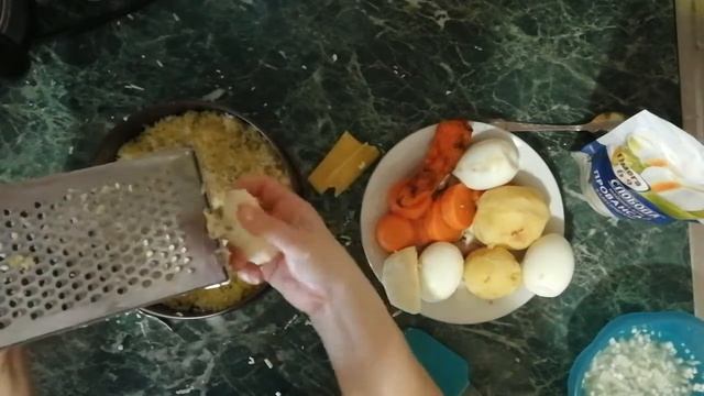 Печеные картофель, морковь - 2 шт., репчатый лук - 1 шт., яблоко - 1 шт., слив. масло - чуть-чуть сыр (по желанию), яйца - 3 шт., консервы рыбные (тунец, сайра, горбуша, сардина) - 1 банка, майонез