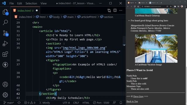Web Dev Roadmap for Beginners (Free!): https://bit.ly/DaveGrayWebDevRoadmap Learn how to use Semantic HTML tags in this full tutorial. HTML5 semantic elements convey both meaning and structure for our web pages. Applying proper semantics to your web pages helps both browsers and assistive technologies interpret your pages. ? Subscribe ➜ https://bit.ly/3nGHmNn ? This lesson is part of an HTML for Beginners tutorial series playlist: https://www.youtube.com/playlist?list=PL0Zuz27SZ-6OlAwitnFUubtE93DO-l0vu ? Starter Source Code: https://github.com/gitdagray/html_course/tree/main/06_lesson ? Course Updates ➜ https://courses.davegray.codes/ Semantic HTML Tags | HTML5 Semantic Elements Tutorial (00:00) Intro (00:05) Welcome (00:25) Setup (01:06) Heading Hierarchy (02:06) nav and hr tags (03:20) The word: "semantic" (04:00) header element (05:33) main element (06:21) footer element (07:30) Labeling multiple nav elements (10:01) article vs section elements (11:49) Adding sections (13:20) aside, details, and summary elements (15:50) mark and time elements (17:57) More sections (19:04) Avoid these HTML tags (for now) (21:04) HTML5 Outliner (23:35) Validate your HTML code ? All Resources for this HTML Tutorial Series: https://github.com/gitdagray/html_course ⚙ Web Dev Tools: Chrome Browser: https://www.google.com/chrome/ Dark New Tab Chrome Extension: https://chrome.google.com/webstore/detail/dark-new-tab/kcphhkbdlfggickaoeiahdcfhagfbajl?hl=en Visual Studio Code (VS Code): https://code.visualstudio.com/ Prettier VS Code Extension: https://marketplace.visualstudio.com/items?itemName=esbenp.prettier-vscode vscode-icons VS Code Extension: https://marketplace.visualstudio.com/items?itemName=vscode-icons-team.vscode-icons Github Themes VS Code Extension: https://marketplace.visualstudio.com/items?itemName=GitHub.github-vscode-theme W3C HTML Validator: https://validator.w3.org/ HTML5 Outliner: https://chrome.google.com/webstore/detail/html5-outliner/afoibpobokebhgfnknfndkgemglggomo ? References: MDN HTML: https://developer.mozilla.org/en-US/docs/Web/HTML MDN HTML Elements Reference: https://developer.mozilla.org/en-US/docs/Web/HTML/Element HTML Entities Character Chart: https://html.spec.whatwg.org/multipage/named-characters.html#named-character-references ? Semantic HTML References: MDN Web Glossary for Semantics: https://developer.mozilla.org/en-US/docs/Glossary/Semantics w3Schools Semantic HTML: https://www.w3schools.com/html/html5_semantic_elements.asp MDN Document and website structure: https://developer.mozilla.org/en-US/docs/Learn/HTML/Introduction_to_HTML/Document_and_website_structure ✅ Follow Me: Github: https://github.com/gitdagray Twitter: https://twitter.com/yesdavidgray LinkedIn: https://www.linkedin.com/in/davidagray/ Blog: https://yesdavidgray.com Reddit: https://www.reddit.com/user/DaveOnEleven Was this tutorial about Semantic HTML elements helpful? If so, please share. Let me know your thoughts in the comments. #html #html5 #semantics