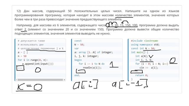 http://egoroffartem.pythonanywhere.com/ege/task/25 На сайте размещены другие задания по этой теме http://egoroffartem.pythonanywhere.com/ege/videotask/25 Список всех разборов 25 задания из ЕГЭ по информатике: https://www.egoroffartem.ru/ege/videotask/ Видео решения задач по ЕГЭ информатике https://vk.com/egoroff_channel В данном группе можете найти информацию о новых видео и задать вопросы по ЕГЭ Информатике Полная информация https://vk.com/@aegorov_tutor-kak-zataschit-25-zadanie-ege-informatika Дан массив, содержащий 50 положительных целых чисел. Напишите на одном из языков программирования программу, которая находит в этом массиве количество элементов, значение которых более чем в три раза превосходит значение предшествующего элемента.