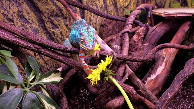 Пантеровый хамелеон ест одуванчик
