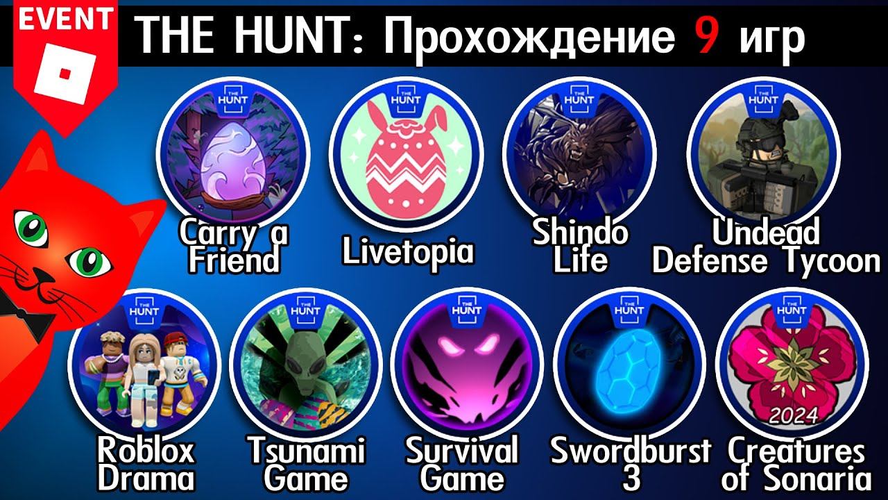 Стань крутым и получай эксклюзивные бонусы! Будь спонсором канала - https://www.youtube.com/channel/UC7jL8M3KBSO47ke9l1os_Fg/join Спасибо за Золотую кнопку YouTube (давайте соберем 3 000 000 подписчиков). Подписаться на канал (Subscribe to channel): https://www.youtube.com/channel/UC7jL8M3KBSO47ke9l1os_Fg?sub_confirmation=1 #роблокс, #roblox, #redcat Сегодня я покажу как получить БЕЙДЖ 91-100 в ивенте ОХОТА 2024 роблокс (The Hunt 2024 roblox). Прохожу игры: Undead Defense Tycoon, Roblox Drama, Livetopia Bus, Shindo Life, Carry A Friend Teamwork Obby, Tsunami Game, The Survival Game, Creatures of Sonaria, Swordburst 3, Ивент - https://www.roblox.com/the-hunt Игра 1 - https://www.roblox.com/games/5670292785/The-Hunt-Undead-Defense-Tycoon Игра 2 - https://www.roblox.com/games/4889315193/Total-Roblox-Drama Игра 3 - https://www.roblox.com/games/6737970321/Livetopia-Bus Игра 4 - https://www.roblox.com/games/4616652839/Shindo-Life-The-Hunt Игра 5 - https://www.roblox.com/games/14448662003/Carry-A-Friend-Teamwork-Obby Игра 6 - https://www.roblox.com/games/7993293100/Tsunami-Game Игра 7 - https://www.roblox.com/games/11156779721/The-Survival-Game Игра 8 - https://www.roblox.com/games/5233782396/HUNT-Creatures-of-Sonaria-Monster-Kaiju-Animal Игра 9 - https://www.roblox.com/games/11523257493/Swordburst-3-BOSS ------------------------------------------------------- Второй канал (RED CAT GAMES) - https://www.youtube.com/channel/UCExXag432rjhB4pbLgVMD0A?sub_confirmation=1 Третий канал (Red Cat WOW) - https://www.youtube.com/@RedCatWOW Телеграм канал - t.me/redcat_official (@redcat_official) Cтраница канала в Инстаграме - https://www.instagram.com/redcatyoutube Сервер в DISCORD - https://discord.com/invite/redcatyoutube (redcatyoutube) Поддержать канал донатом: Все страны - https://donatepay.ru/don/redcat Украина - https://red-cat.diaka.ua/donate Мой профиль в РОБЛОКС (ник ORedCat) - https://www.roblox.com/users/531556867/profile Мой СЕРВЕР и МЕРЧ в Роблокс - https://www.roblox.com/groups/4046965/Red-Cat-Channel#!/store Моя игрушка в Роблокс (Красный кот) - https://www.roblox.com/catalog/13175970108/Red-Cat-Pal ------------------------------------------------------- Смотрите еще много всего интересного на канале Red Cat. Надеюсь вам понравится и вы останетесь. Не ходите по другим каналам, тут вас любят! Мяу