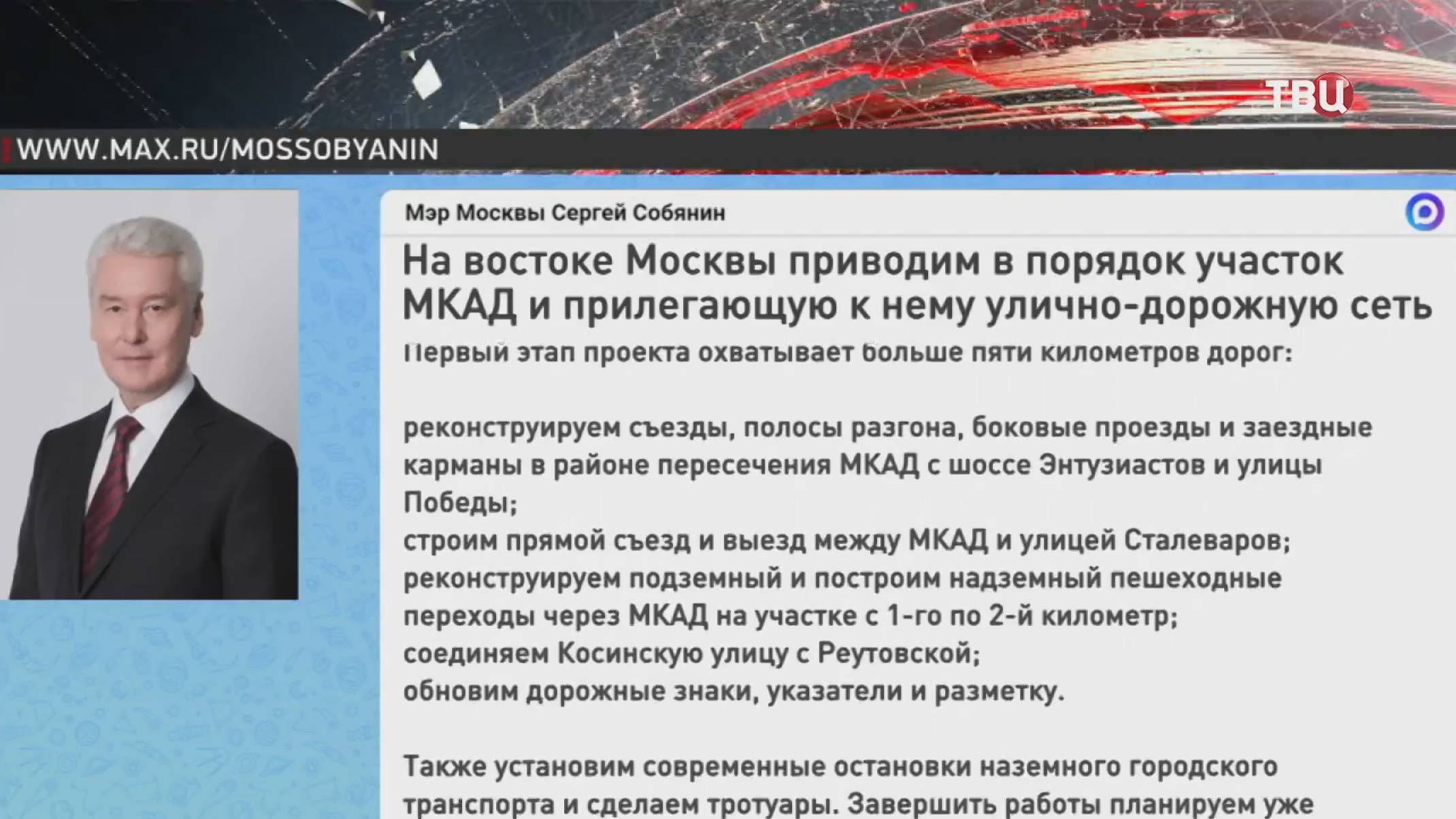 Собянин рассказал о масштабной реконструкции дорог на востоке Москвы / События на ТВЦ