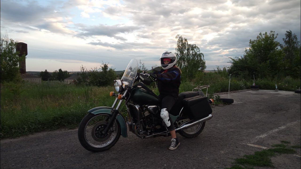 Учу дочку езде на мотоцикле.