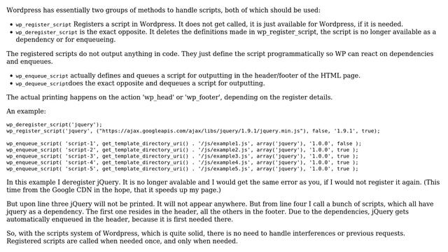 Wordpress: WordPress Script Loading/Unloading -- wp_deregister_script('jquery') Helpful? Please support me on Patreon: https://www.patreon.com/roelvandepaar With thanks & praise to God, and with thanks to the many people who have made this project possible! | Content (except music & images) licensed under cc by-sa 3.0 | Music: https://www.bensound.com/royalty-free-music | Images: https://stocksnap.io/license & others | With thanks to user zipzit (https://wordpress.stackexchange.com/users/45680), user Pieter Goosen (https://wordpress.stackexchange.com/users/31545), user Hendrik Luehrsen (https://wordpress.stackexchange.com/users/38514), and the Stack Exchange Network (http://wordpress.stackexchange.com/questions/152559). Trademarks are property of their respective owners. Disclaimer: All information is provided "AS IS" without warranty of any kind. You are responsible for your own actions. Please contact me if anything is amiss at Roel D.OT VandePaar A.T gmail.com.