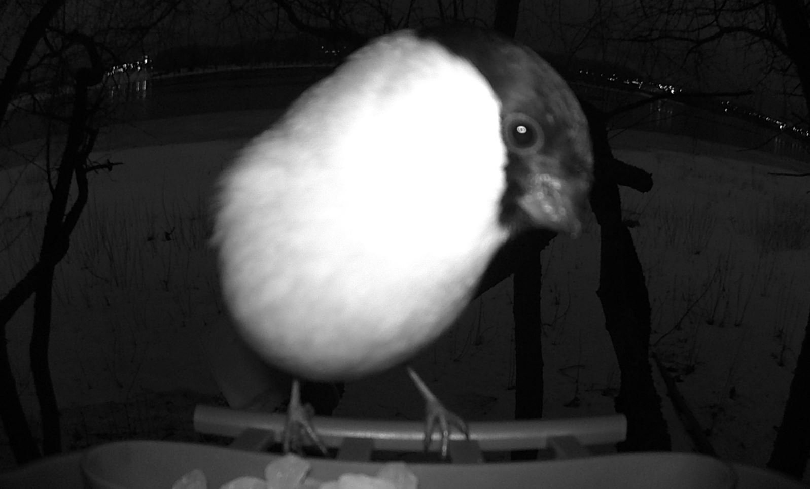 Наблюдения птиц в Великом Новгороде, снегири у кормушки ранним утром 16.02.2023
