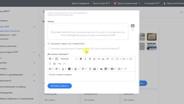 Добавление новостей на глувную страницу сайта СНТ