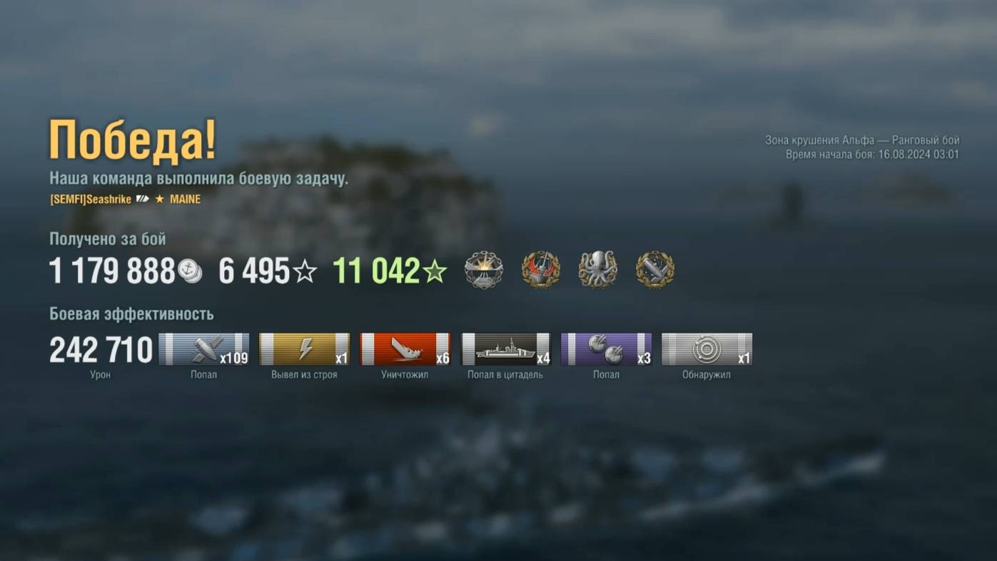 Супер линкор Maine Игрок: Seashrike (NA) Карта: Зона крушения Альфа - Ранговый бой Урон: 242к Maine - супер линкор США Без модов!